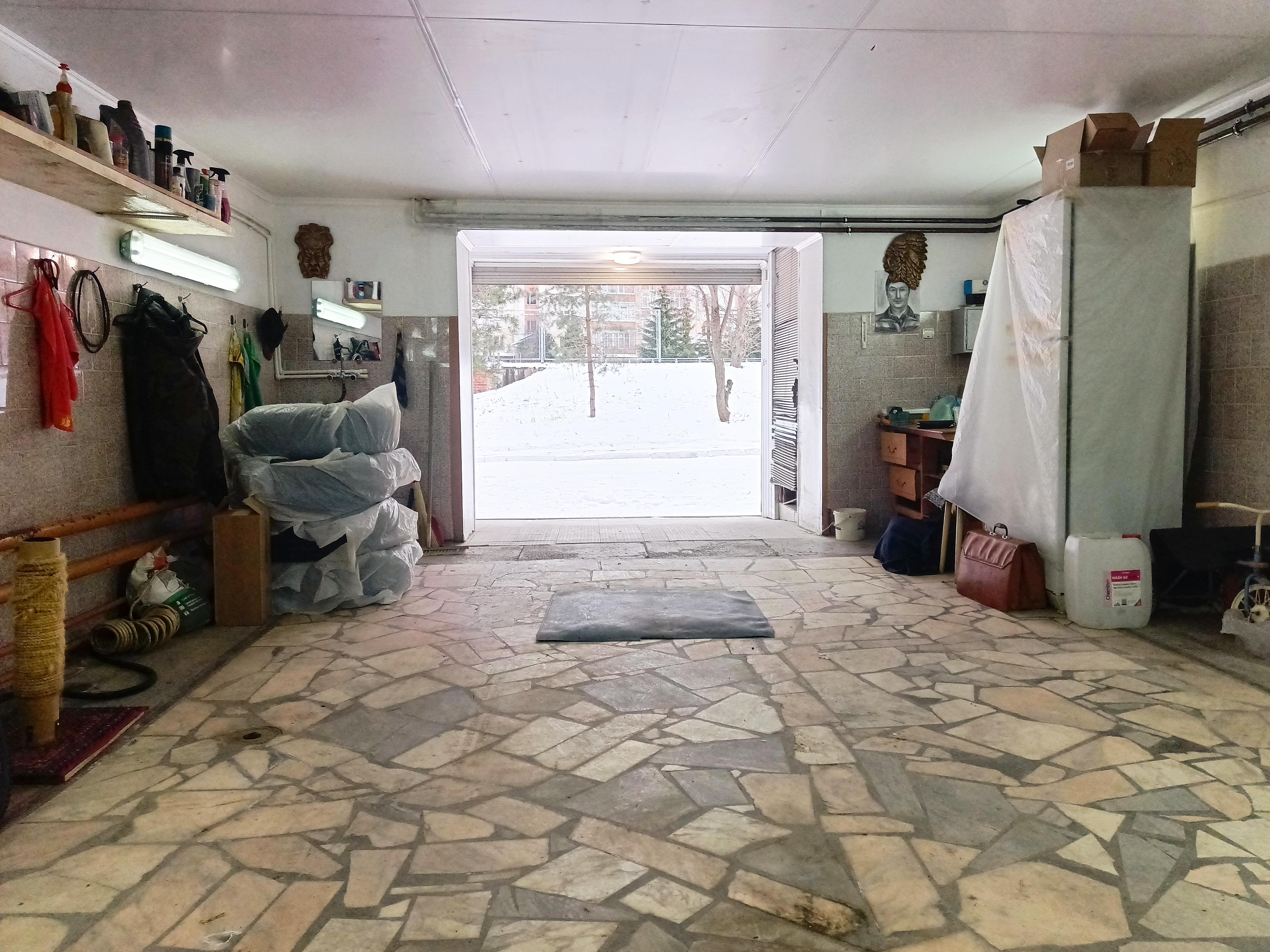 На первом этаже есть свой большой гараж. Вход в него прям с коридора подъезда. Электричество, горячая и холодная вода, погреб, всё это есть.